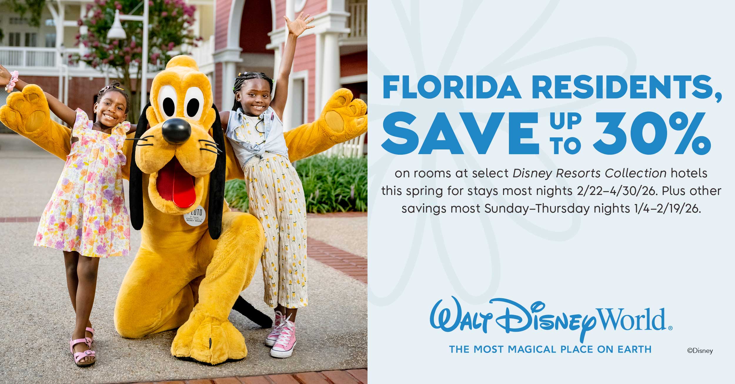 Important Details: The number of rooms allocated for this offer is limited. Length-of-stay requirements may apply. Additional per-adult charges may apply if more than 2 adults per room at Disney Value, Moderate and Deluxe Resorts, and Studios at Disney Deluxe Villa Resorts. Cannot be combined with any other discount or promotion, except for the 2026 Kids Dining Plan Offer. Advance reservations required. Offer excludes the following room types: 3-Bedroom Villas; Deluxe Resort Suites; Cabins at Copper Creek Villas & Cabins at Disney’s Wilderness Lodge; 2-Bedroom Villas at Disney’s Beach Club Villas; and Bungalows, 1-Bedroom Villas, 2-Bedroom Villas and Penthouses at Disney’s Polynesian Villas & Bungalows. When booking this Florida resident offer, your credit card or payment method must be associated with a Florida billing address. Valid admission is required to enjoy the theme parks and is not included in this offer. Theme park reservations may be required based on admission type.